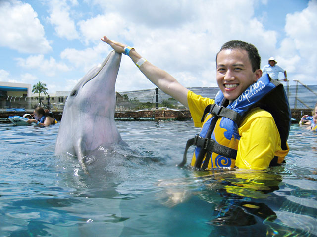 Our trip to Cancun this summer was our first attempt at the traditional “beach vacation.” In the past, our trips have always been packed with activities. This time, we decided instead to splurge on a luxury beach resort near Playa del Carmen. Unsure of how long we could survive doing nothing, we opted for a brief 4-night stay with no activities planned in advance. We even saved a few bucks by traveling during hurricane season and forgoing travel insurance. But when we heard about Hurricane Irene moving up the East Coast, we knew we were in trouble. By the time I left work on Friday, we found that our Sunday flight had been canceled. We spent nearly 4 hours on our cell phones, Skype, and Twitter, desperately trying to reach a Delta representative. Luckily, we averted the crisis by arranging to fly out a day earlier, which meant frantically packing and rushing to the airport within 2 hours of our phone call to catch the flight. Arrving in Cancun a day ahead, we checked into the Courtyard Marriot near the airport, but only to realize that Melody had forgotten her contact lenses! Frantic again, we hopped onto the local bus to look for replacements. Luckily, we saw a Sam’s Club along the way and leapt off the bus in joy. With all our remaining pesos and some broken Spanish, we were able to get a new set of contacts to restore my wife’s vision. Our stay at the 5-star Rosewood Mayakoba resort was nothing short of extraordinary. Sipping our welcome cocktails, we were taken to our suite on a boat tour through the private lagoon. After docking, our butler introduced us to the amenities – private boat dock, heated plunge pool, roof deck with day bed, and both indoor and outdoor showers. We enjoyed a sea side Mexican dinner on site with classic sopa de lima and conchita pibil. On Monday, we ferried to Cozumel to visit the Chankanaab national park, where we swam with dolphins, sea lions, and even manatees! We also snorkeled for a couple of hours, though the required life vests and bouyant salt water made it difficult to dive below the surface for underwater photos. We returned to Playa del Carmen in the evening for dinner at Yaxche for delicious authentic Mayan fare. The next morning started with Melody accidentally dropping her Kindle on the floor and my erroneously deleting the cell phone settings for PlayOn streaming. Cut off from our usual entertainment, we took advantage of the resort facilities – the sculptured swimming pool, the club room pool table, and of course, cable TV, where we watched Serena Williams crush her opponent at the US Open. On Wednesday, after our kayaking attempt was foiled by stormy waves, we decided to stay by the beach, where the constant offering of free goodies like mango popsicles, strawberry slushies, cucumber eye covers, facial massage, and sunglass cleaning service (you can’t make this stuff up) kept us in utter relaxation. We returned to Boston refreshed, and thankful to have the long weekend ahead before returning to work.