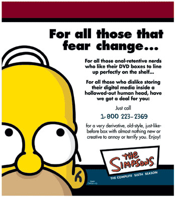 When Melody noticed the newly-released Simpsons 6th Season DVD box-set, her immediate thought was: “Glenn’s not gonna like this.” Indeed, when I went to BestBuy yesterday and saw the bright yellow plastic box shaped like Homer’s head, I became overwhelmed by a sudden fear. How in the world am I going to fit this into my neatly-aligned row of DVD boxes? Just then, a note fell out of the box with the words “To All Those That Fear Change” printed in bold letters. I gave a sigh of relief as I read about their alternative packaging offer to get an unimaginative old style replacement box designed specifically for us “anal-retentive nerds who like their DVD boxes to line up perfectly on the shelf.” Heheh. Well-played, Mr. Groening. Anyway, the week’s been otherwise the same old thing, with the exception of a trip down to New York for Leo’s wedding. Beside satisfying our Japanese noodle craving once again, we also decided to try something new. I will not expound further, but let’s just say that it’s a privilege to have such an understanding girlfriend. =)
