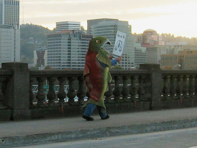 Portland, OR marks the third destination for this month of travel. Melody had barely recovered from her 2-day exam, when we took off early Wednesday morning to visit her sister and brother-in-law. Since Portland was more or less lacking in big tourist attractions, we were able to take things slowly. We spent our first day bumming around the neighborhood and local shopping mall, taking note of all the other lazy bums who weren’t at work on a weekday. With little knowledge of the area, we just hit some nearby places for lunch and dinner. On Thursday, we decided to bond with nature, starting with a meditative stroll through the Japanese Garden, followed by a photography spree amidst the award-winning roses in the Rose Test Garden, and finishing with a visit to the Classical Chinsese Garden. We had hoped to grab lunch at the upscale Pearl District, but distracted by frequent stops at the various kitchen and home furnishing stores along the way and with most of the restaurants closing between lunch and dinner, we ended up driving to good ol’ Chinatown for some chow. Unfortunately, Portland’s Chinatown turned out far differently from what we expected, populated mainly by Chinese-American imitation cuisine and seedy shops with names like “Hung Far Low” which prompted us to quickly depart the area. Along the drive back for dinner, we witnessed the politically-active atmosphere of this city as we passed by what looked like a protesting fish. Friday, we drove to the town of Newport to visit the Oregon Coast Aquarium. Aside from the captivating view of the shark tank, however, the exhibits were pretty mediocre, with a sorry excuse for a new bat exhibit which featured tons of models, drawings, and videos, but only 4 live bats. A stop at the food court was equally disheartening, with sub-Progresso-quality chowder that left something to be desired. Unsatisfied, we drove into town afterwards to redeem ourselves with some real chowder and fresh, deep-fried seafood at the local favorite, Mo’s Original, before embarking on the drive home. With Emmeline and Eugene, our evening concluded with some outstanding Pacific Northwest cuisine at Wildwood with take-home treats from Papa Haydn for dessert. On our last day, I took the last opportunity to indulge in my first conveyor-belt sushi experience at the aptly-named Sushi Land before our red-eye flight back home. Overall, I found Portland to be easy on the eyes, but with the dirth of some authentic Chinese dining venues, it may prove to be a bit tough on the palate.